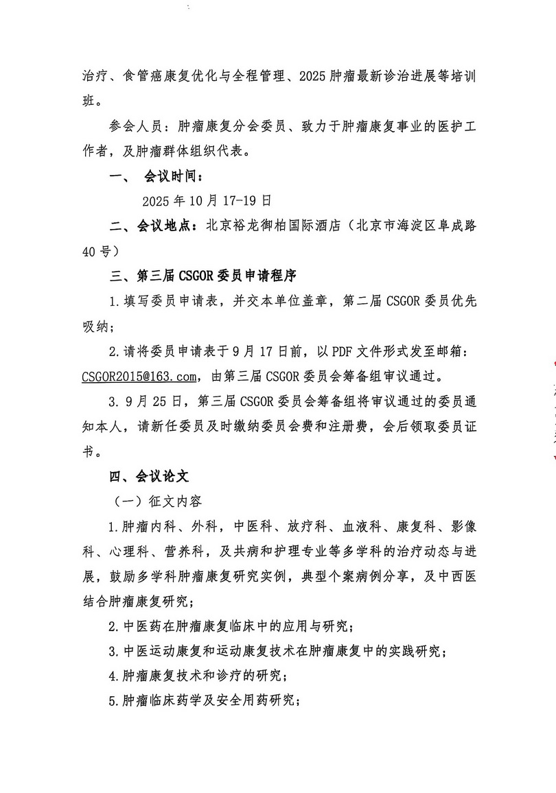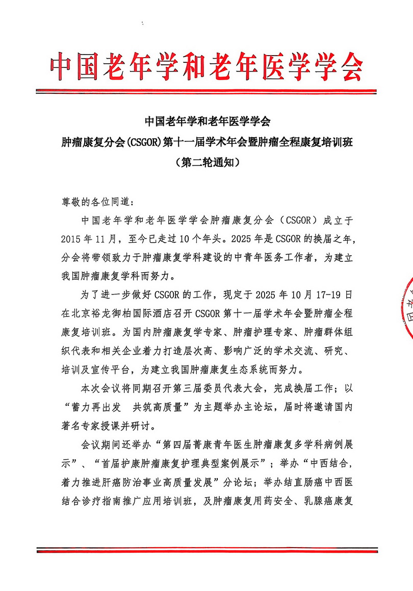 腫瘤康復分會(CSGOR)第十一屆學術年會暨腫瘤全程康復培訓班(第二輪通知)