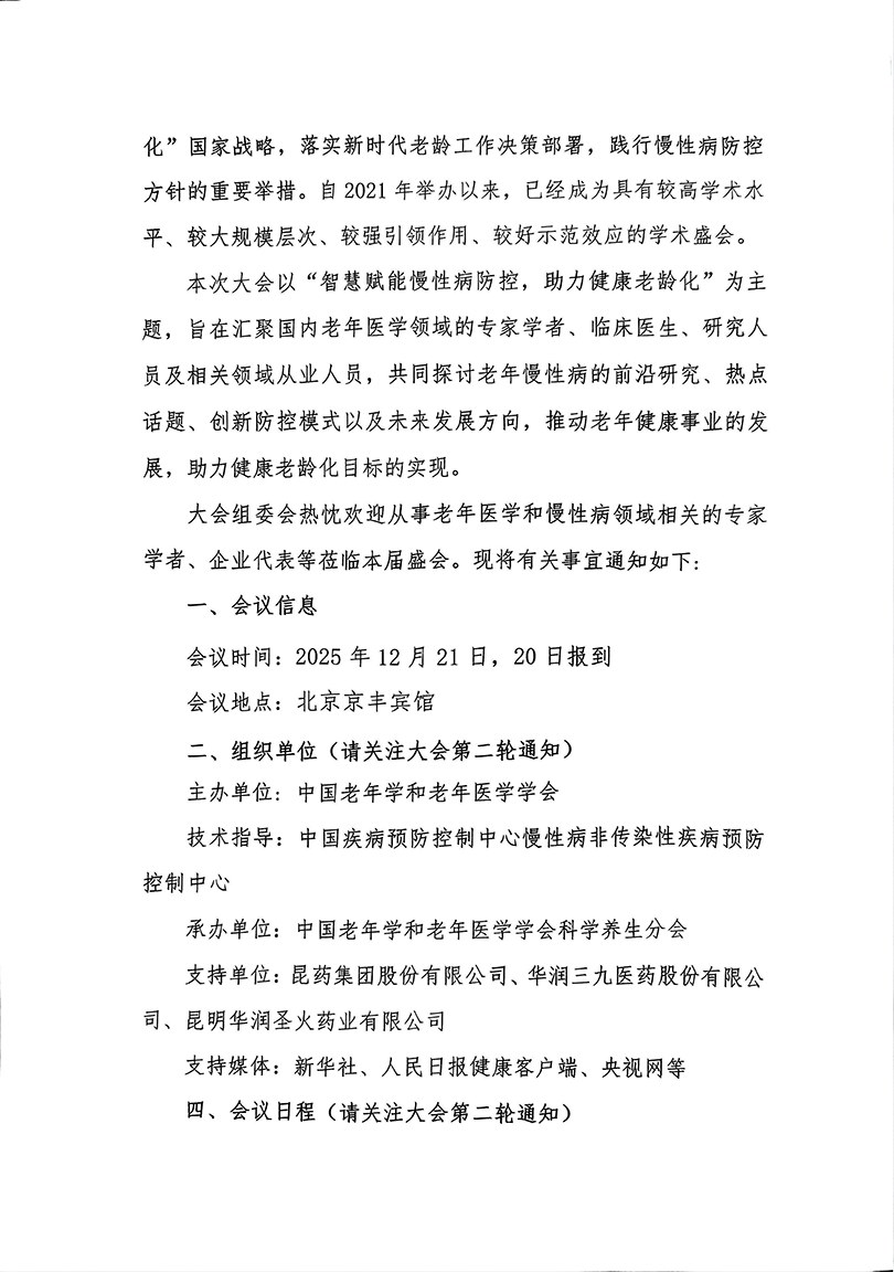 隨著全球人口老齡化加劇,老年慢性病的發病率和患病率不斷上升,給個人、家庭和社會帶來了沉重負擔。老年慢性病的科學防控已成為全球公共衛生領域的重大挑戰。為認真貫徹黨的二十屆四中全會精神,全面落實健康中國戰略,促進我國老年慢性病防治工作、推動健康老齡化、創新防控模式,中國老年學和老年醫學學會擬于2025年12月在北京舉辦第五屆老年慢性病防控大會。